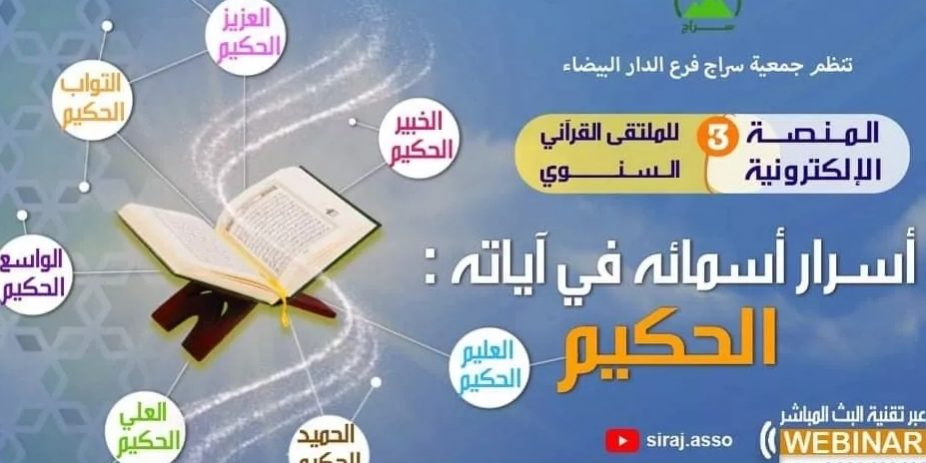 الملتقى السابع للقرآن الكريم لفرع لدار البيضاء : التدبرفي “أسرار أسماء الله الحسنى في خواتيم الآيات” في القرأن الكريم ، إسم الله “الحكيم” كونوا معنا على قناة اليوتوب للجمعية يوم 14 رمضان 1443، الموافق 16 أبريل 2022 ابتداءا من الساعة الواحدة ظهرا
