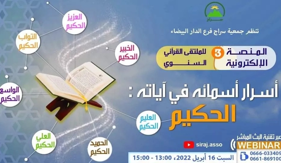 الملتقى السابع للقرآن الكريم لفرع لدار البيضاء : التدبرفي “أسرار أسماء الله الحسنى في خواتيم الآيات” في القرأن الكريم ، إسم الله “الحكيم” كونوا معنا على قناة اليوتوب للجمعية يوم 14 رمضان 1443، الموافق 16 أبريل 2022 ابتداءا من الساعة الواحدة ظهرا الملتقى الثالث للقرآن الكريم لفرع الرباط : التدبر في القرأن الكريم ، بعنوان…